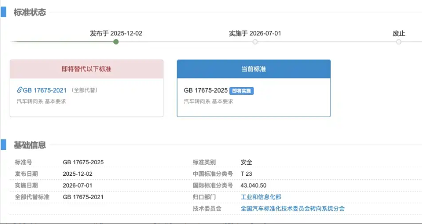 据工信部网站信息,标准号GB17675-2025《汽车转向系 基本要求》国家认证标准正式发布,2026年7月1日起将正式实施。新标准为了适应线控转向(SBW)、电动助力转向(EPS)等新型专项技术的发展,删除了相关机械连接的强制要求。强化转向系统失效后的冗余能力,同时引入功能安全术语和验证方法,要求转向电子控制系统满足ISO 26262等国际标准对应的功能安全等级。