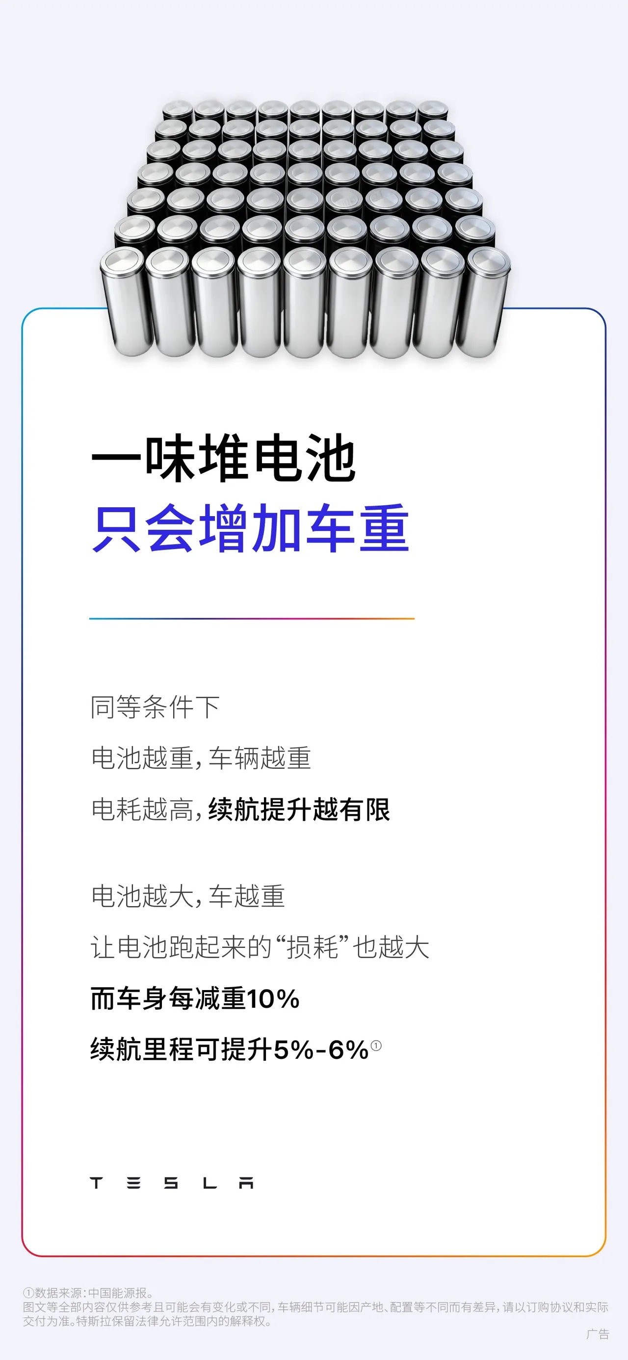 第二点,特斯拉称“一味堆电池,只会增加车重”。同等条件下,电池越重,车辆越重,电耗越高,续航提升越有限,而车身每减重10%,续航里程可提升5%-6%,一些车堆100度电池,比Model 3重几百斤,续航也没超过Model 3,一些车比Model Y重1000+斤,续航不如Model Y,一些车比Model Y L重1000斤,续航比Model Y L少100+公里。