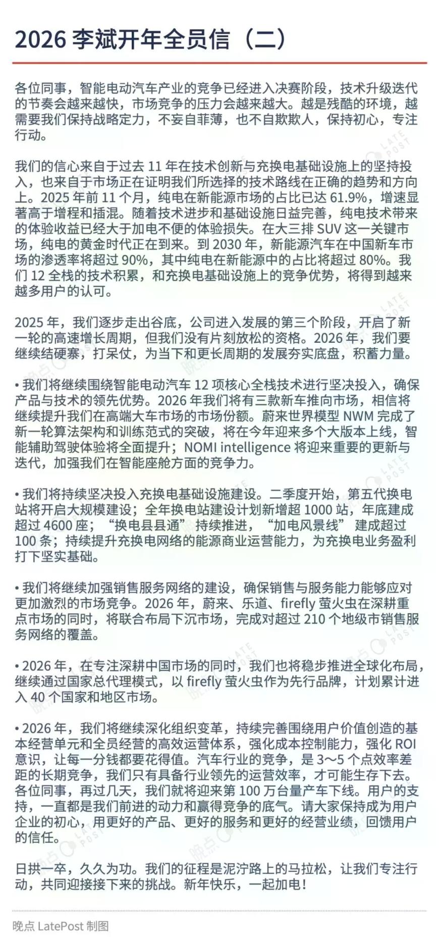 他在信中肯定了蔚来过去一年取得的成绩。蔚来在2025年共交付新车超过32.6万辆,创下年度交付历史新高。他透露,公司在过去一年实施了“艰难但必要”的组织变革,通过强化全员经营意识与严格的成本控制,成功提升了体系能力,认为蔚来已逐步走出经营谷底。