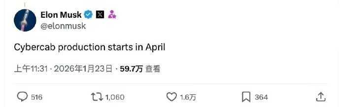 凤凰网科技讯 1月26日,马斯克在X平台回帖,再次确认特斯拉旗下自动驾驶无人出租车Cybercab将于今年4月量产,目前原型车已在美国阿拉斯加展开冬季测试。值得注意的是,测试中的Cybercab配备了雪地轮胎。