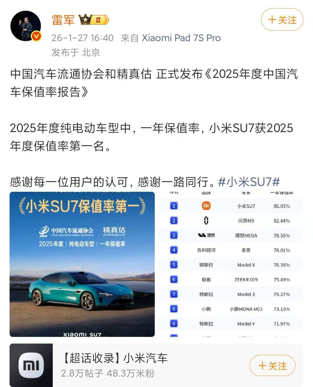 1月27日,小米集团董事长兼CEO雷军回应了小米SU7保值率第一名。根据中国汽车流通协会和精真估发布的《2025年度中国汽车保值率报告》,小米SU7获得2025年度纯电动车型一年保值率第一名,对此,雷军表示“感谢每一位用户的认可,感谢一路同行。”