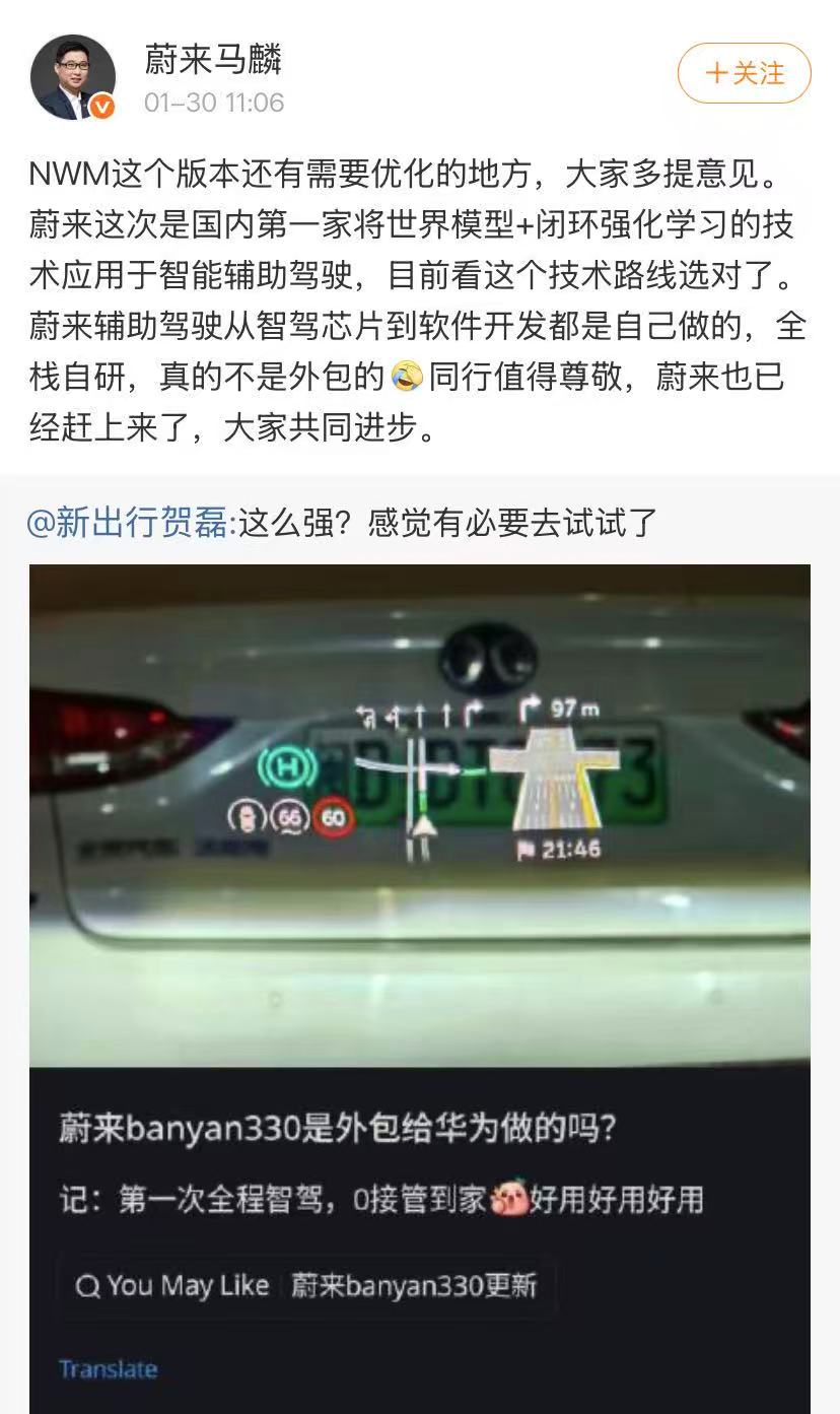蔚来汽车品牌与传播助理副总裁马麟对此回应表示“蔚来从智驾芯片到软件开发均为自主研发”,而且是国内首个落地「世界模型 + 闭环强化学习」技术方案的智能辅助驾驶系统,该技术路线经实践验证具备可行性,他认为“同行值得尊敬,但蔚来已经达到行业先进水平,大家可以共同进步”。