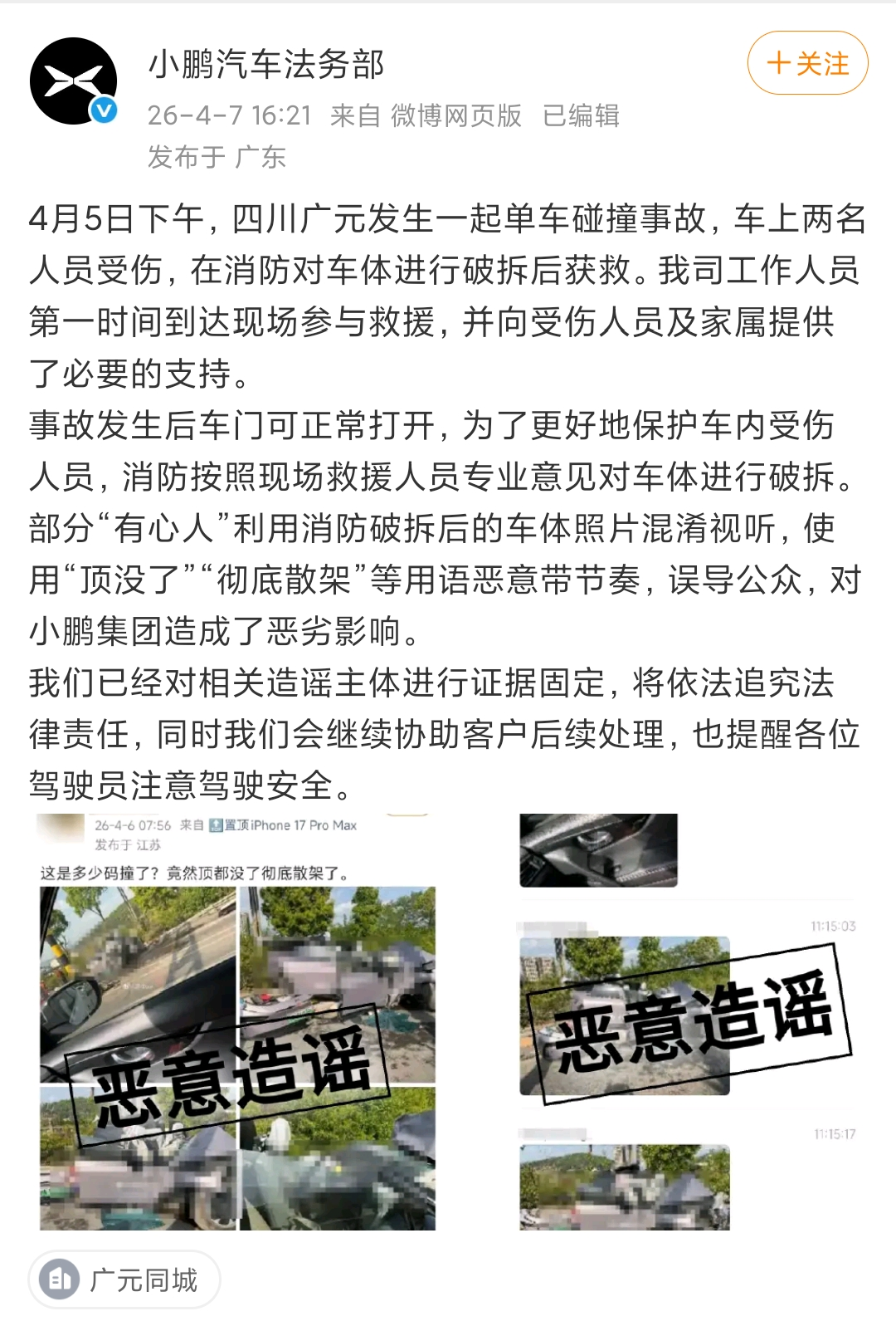 事故发生后车门可正常打开,为了更好地保护车内受伤人员,消防按照现场救援人员专业意见对车体进行破拆。部分‘有心人’利用消防破拆后的车体照片混淆视听,使用‘顶没了’‘彻底散架’等用语恶意带节奏,误导公众,对小鹏集团造成了恶劣影响。