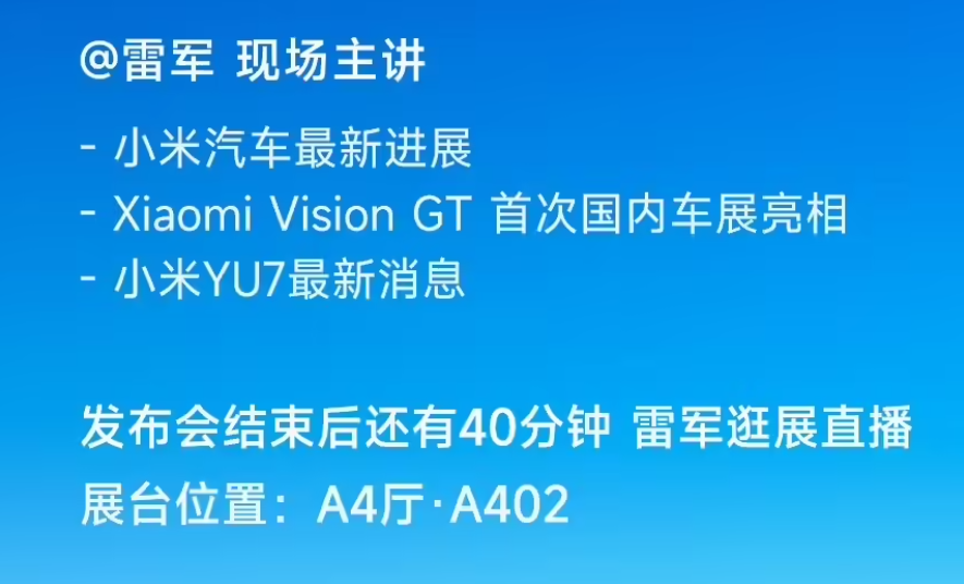 小米汽车今日宣布,明早9点,小米汽车北京车展发布会准时开场,雷军现场主讲。据悉,该发布会将带来小米汽车最新动态、Xiaomi Vision GT国内车展首秀、YU7新消息等。发布会后,还有40分钟雷军逛展直播。